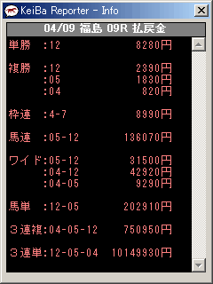 KeiBa Reporter(以下KBR)は、レースの発走時刻や馬体重、払戻金などをリアルタイムにお知らせする、競馬リアルタイム報告ソフトウェアです。