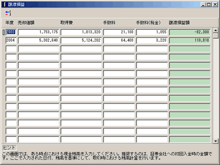 確定申告処理のタイミングで年度別に譲渡損益が算出されます。過去の損益も登録することができます。(上場株式等に係る譲渡損失の繰越控除に対応)