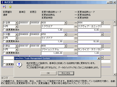 [ 8]確認メッセージが表示されます。基準日がこの操作をしている今の日付以前のものを対象に更新を行います。つまり、基準日に到達している取引データが存在する場合、基準日を超える取引データは株式変更後の取引データであると認識し、基準日以前の取引データについて、変更更新が行われます。(変更内容はログに記録されます。)