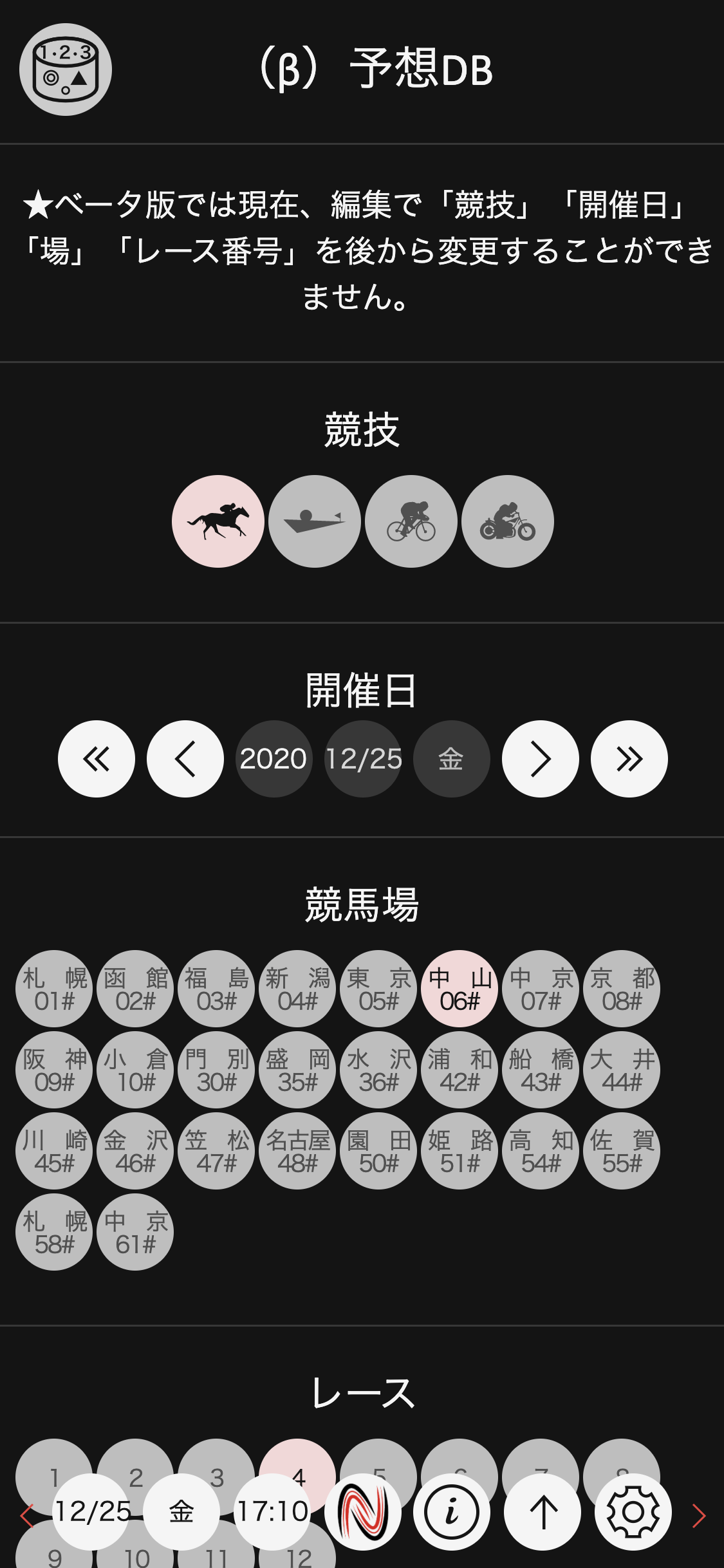 公営競技予想情報投稿アプリ「予想DB(以下TIPS-DB)」は、公営競技(中央競馬/地方競馬/競艇(ボートレース)/競輪/オートレース)の予想情報を投稿・公開できるGAMBLE-OSアプリです。 本命(◎)・対抗(○)・注意(▲)などの印予想と独自のポイント・指数、コメントや買い目などを登録でき、予想情報としてGAMBLE-OS上で公開することができます。 予想データをどんどん登録して蓄積し、自分だけの予想データベースを作ることで、どのような条件で、どのように買えば、回収率・的中率が効果的になるかをシミュレーションできるようになります。(*1) 予想データのCSVインポート/エクスポート機能も準備しており、効率よくデータを登録したり、登録した予想データをExcelなどで活用できたりします。 GAMBLE-OS上では、アクセス数や回収率などの各種ランキングも発表し、Team-Nave CLUBでのパカラン(pk)進呈や表彰なども予定しています。 *1:現在開発中で2021年度中に実装予定です。 <機能一覧> ・予想DBポータル ・ホーム ・新規投稿 ・CSVインポート機能 ※将来対応予定 ・CSVエクスポート機能 ※将来対応予定 ・シミュレーション機能 ※将来対応予定 <ご利用方法> GAMBLE-OS版アプリをご利用いただくにあたり、Team-Nave-CLUBへのご登録が必要となります。 1)Team-Nave-CLUBへのご登録がまだの方は、GAMBLE-OSより、ご登録ください。 2)Team-Nave-CLUBへのご登録が終わりましたら、GAMBLE-OSにログインしてください。 3)画面下中央の(N)アイコンを2回押して、デスクポップを表示し、新着タブから「予想DB」を押し、アプリをインストールしてご利用ください。 特記事項